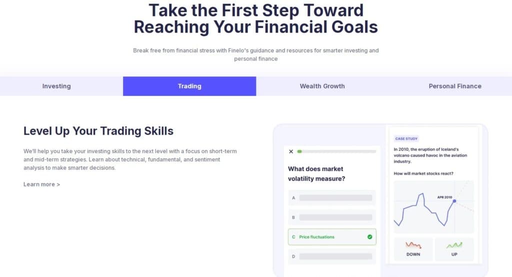 | Finelo | Simulated financial playground for risk-free practice | Real-world investing simulator, personalized learning paths, streaks, and daily goals |